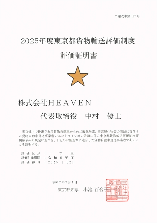 2025年東京都貨物評価制度にて優秀事業者認定書をいただきました